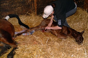 As the foal emerges, the inner sac usually breaks. If the sac does not break, free the foal from the sac and wipe the nose and mouth. Foals not breathing well should be rubbed vigorously with a towel to stimulate breathing. Allow the foal to lie quietly behind the mare for 10 to 25 minutes until the pulsations in the umbilical cord cease. This allows the foal to take advantage of the blood remaining in the placenta still attached to the uterus. Then crush the navel cord and separate it three inches from the body and dip in antiseptic (iodine and glycerine). This antiseptic will destroy bacteria, help dry up the stump, and prevent infections. Dip the stump again in a few hours. Some individuals also dip the feet (a possible portal of entry for bacteria).